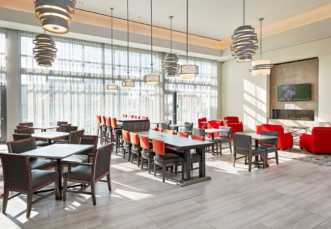 Our modern guest rooms at Hampton and our suites at our Homewood Suites feature free WiFi, 32-inch HDTV and plenty of plugs to charge your devices. Head to the lobby for free hot breakfast each morning, or grab one of Hampton’s On the Run™ Breakfast Bags, available Monday through Friday. If staying with the Homewood Suites, you also have access to our Evening Socials Monday- Thursdays featuring complimentary light dinner and beverages including beer and wine.